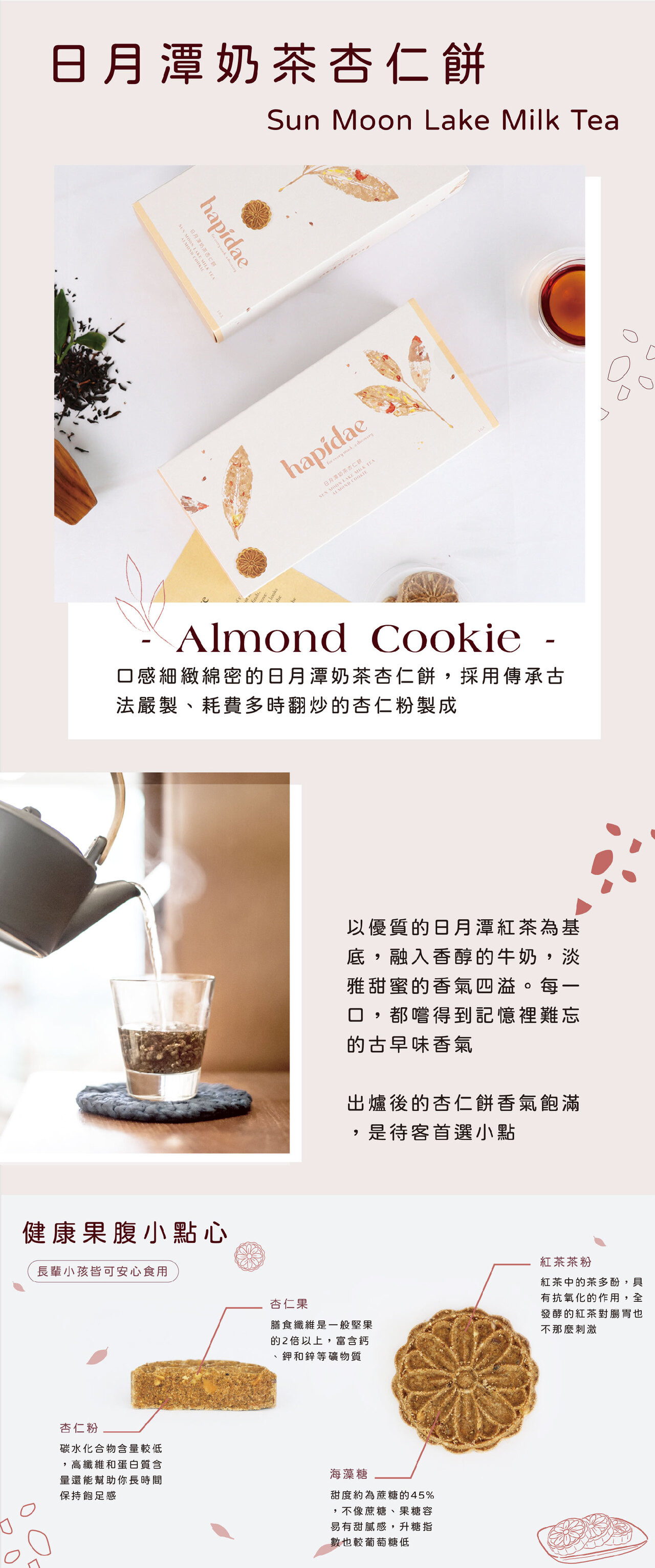 以日月潭紅茶為基底,融合濃厚奶茶香調,製作成口感酥脆的杏仁餅。