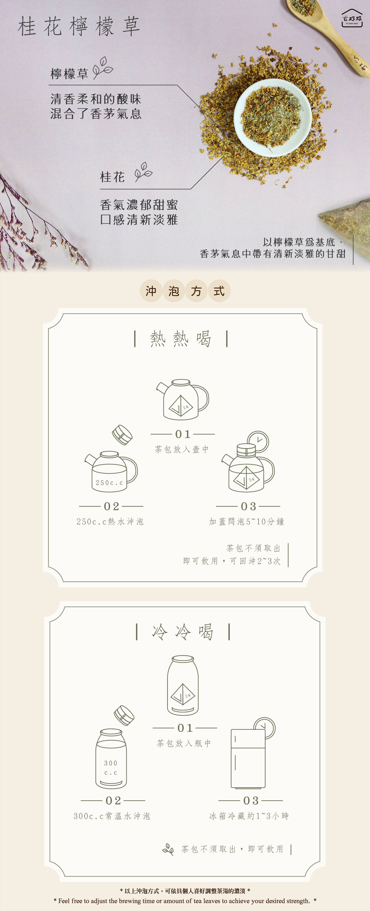 【它好好】無咖啡因桂花檸檬草茶,選用天然桂花與檸檬草調和而成,桂花幽香細緻、檸檬草清爽帶青草氣息,入口溫潤不刺激,是一款連情緒都能一起被安撫的花草茶。 全系列無咖啡因設計,適合日常放鬆、午後沉澱,或睡前與自己好好相處的時刻。2g 獨立茶包 ×15 入,沖泡方便,香氣剛剛好,不多不少,剛好讓生活慢下來。 發掘好物,選擇好的,它好好 It’s so good——讓每一杯桂花檸檬草茶,成為你日常裡最穩定的溫柔 KPI。
