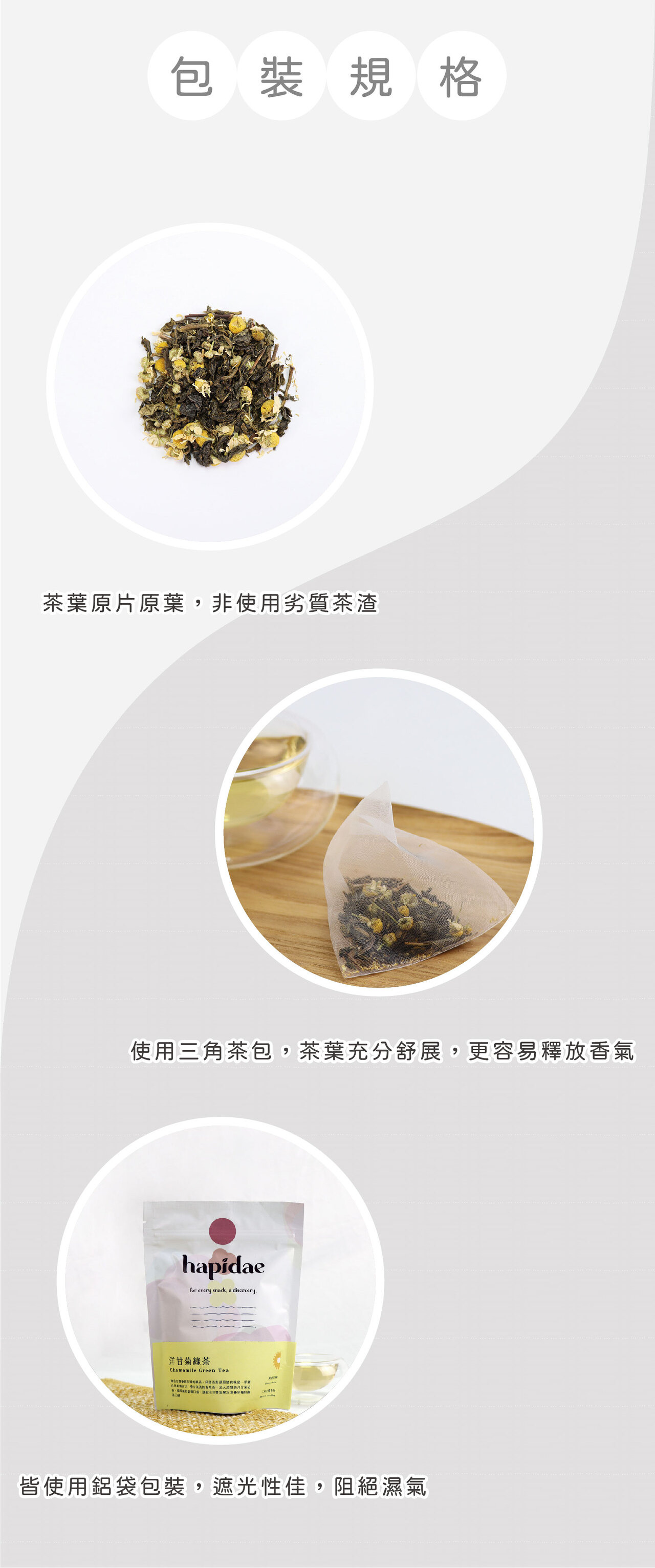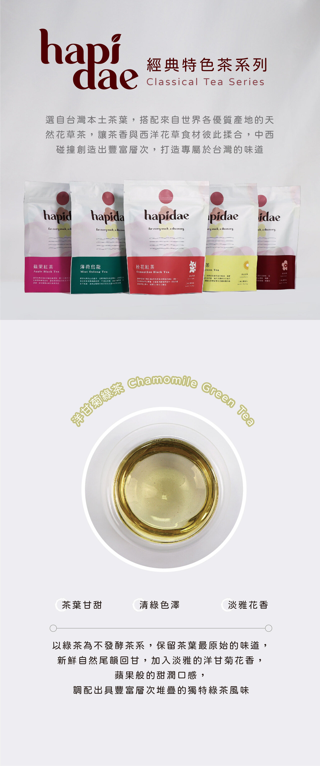 【hapidae 洋甘菊綠茶|清新綠意 × 溫柔花香】 舒壓、放鬆、助眠,一包搞定! 選用台灣在地綠茶,搭配來自世界各地的天然洋甘菊花草,清新茶香與溫柔花香完美交融,每一口都是中西碰撞的專屬台灣味。