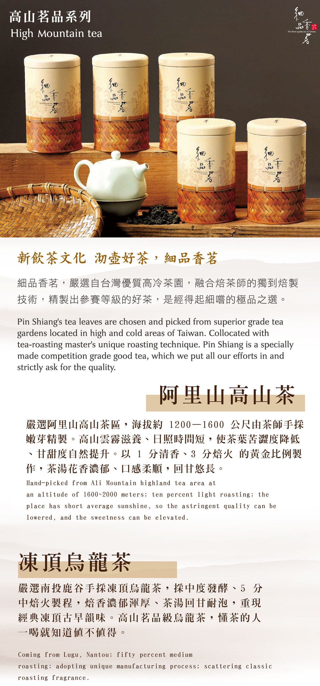 手採阿里山高山茶區,海拔約1200~1600公尺,1分清香、3分焙火,平均日照短,使茶樹芽葉苦澀成分降低,也提升甘甜味,有著濃郁花香。