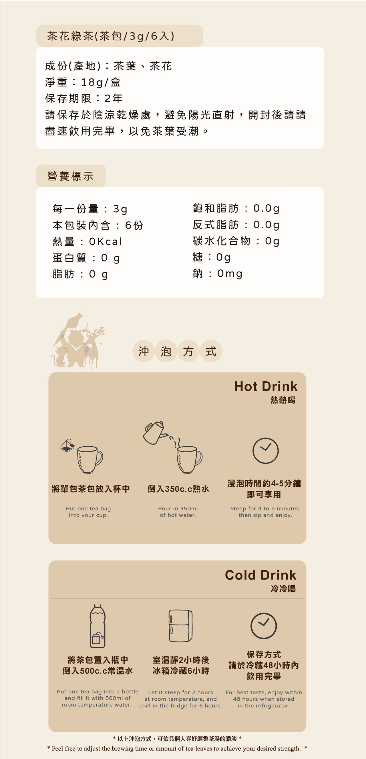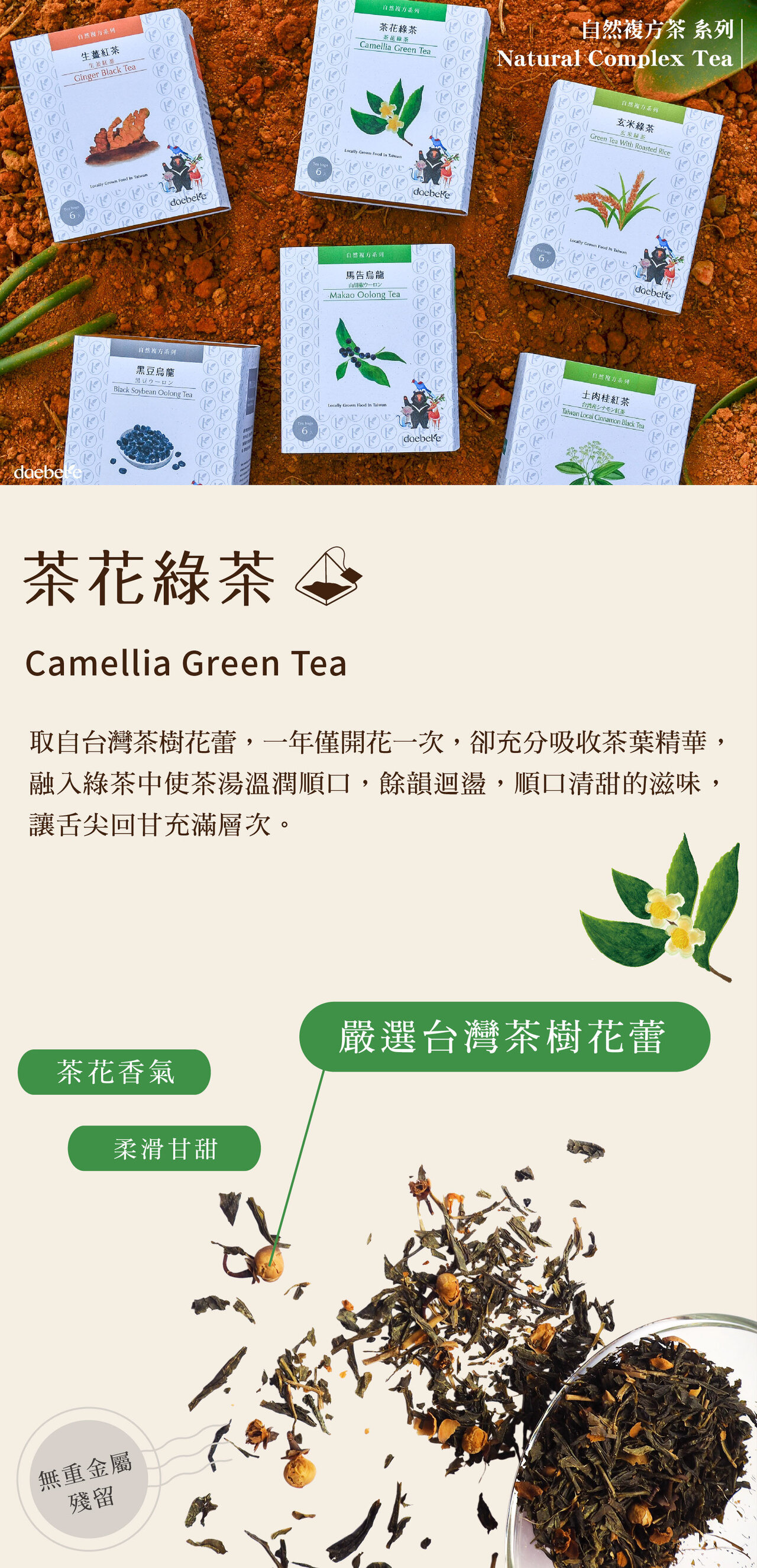 台灣茶樹一年只開一次花,花蕾吸飽了茶葉精華,就像茶界的 VIP。茶花綠茶三角茶包將這份淡雅融入溫潤的綠茶茶湯中,每一口都回甘層次分明, 清甜順口,讓舌尖偷偷開心。 我們堅持 台灣在地食材 + 自然農法茶園,打造專屬台灣的茶花好味道。無論早晨醒腦,或午後小憩,一杯茶花綠茶都能溫和守護你的健康, 也讓生活多一點自然的俏皮感。