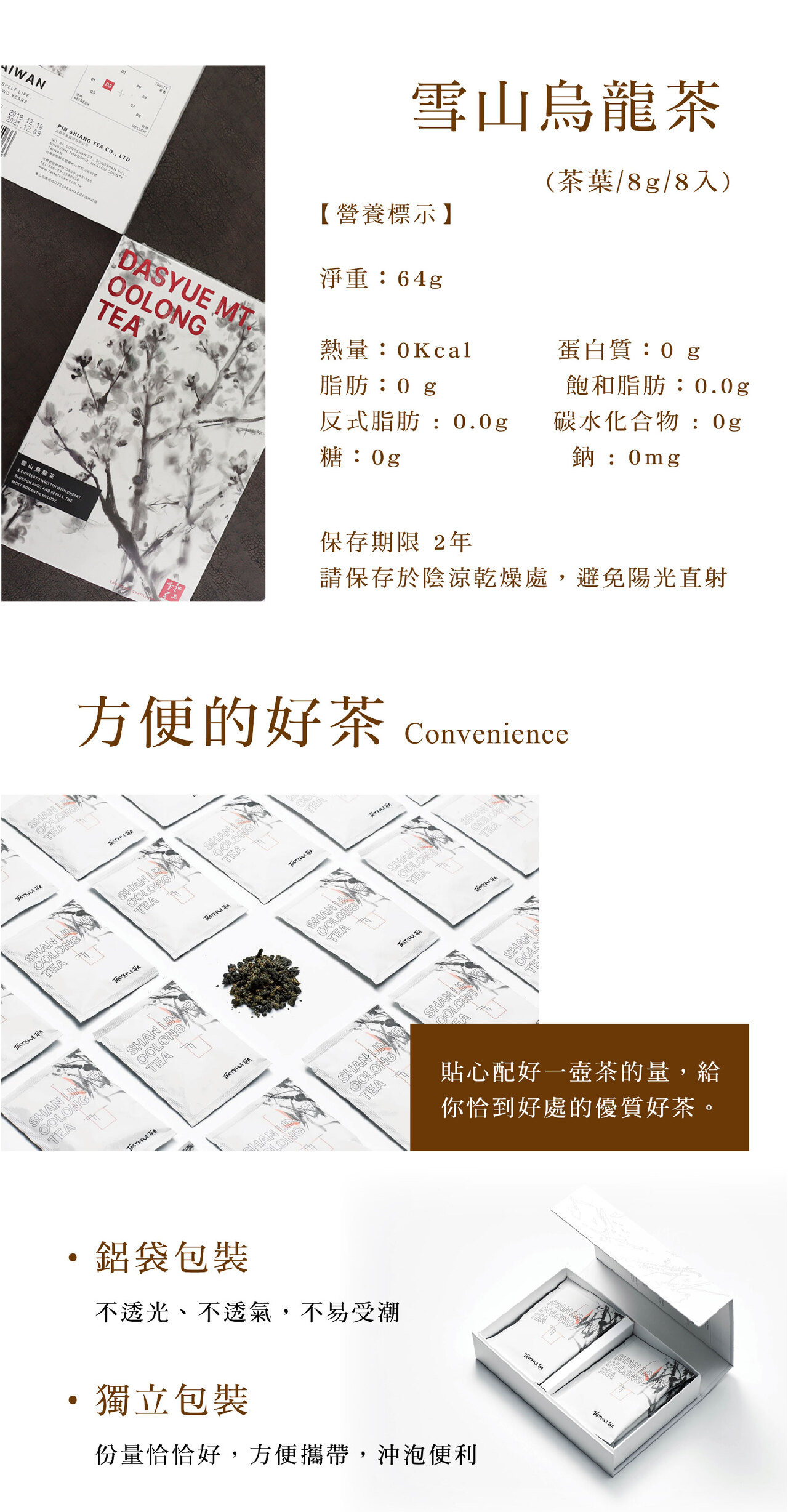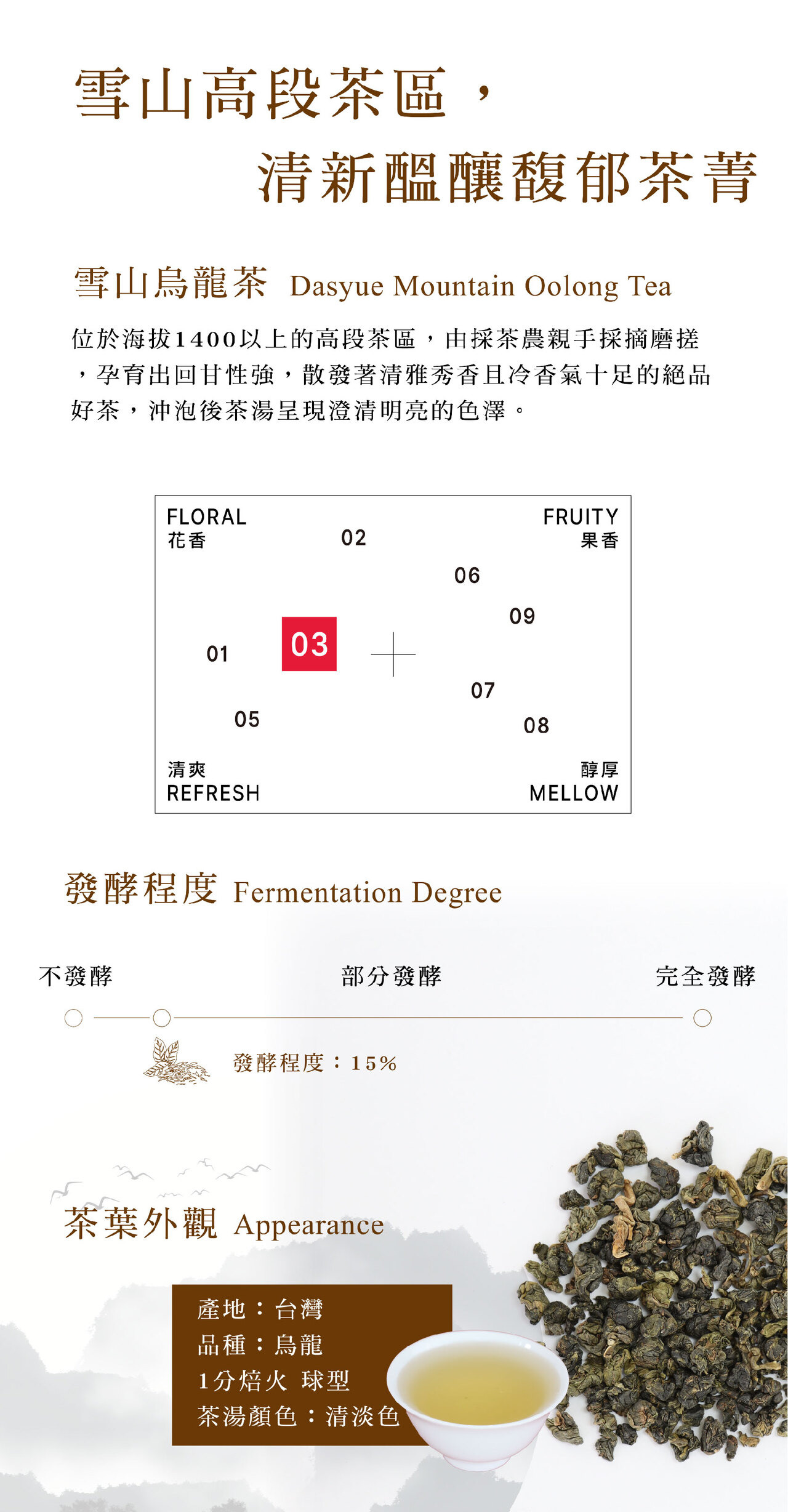 冰雪滋養的雪山烏龍茶,來自海拔1400公尺以上的高山茶區,每一片茶葉都由茶農親手採摘、精心磨搓。清雅秀香伴隨冷香氣,茶湯澄澈明亮,回甘十足,一口就能感受 雪山高山茶的清冽氣息。 迎接新春佳節,選擇小細品系列雪山烏龍茶,不只是送禮,更是一場台灣八大山頭茶香的高山體驗。無論自家品茗或招待好友,都能展現品味與心意,讓茶香溫暖每個冬 日時光。