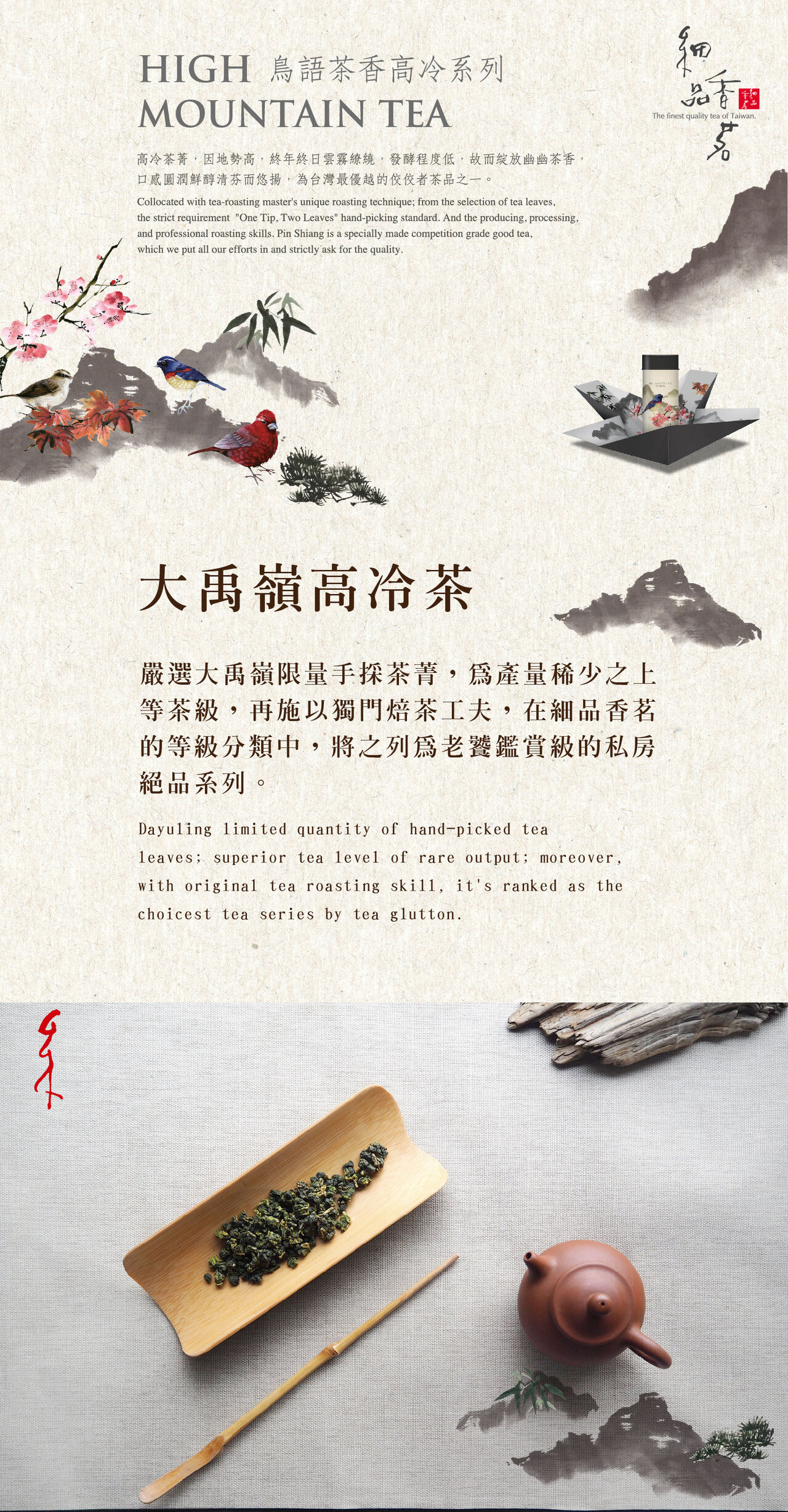 嚴選大禹嶺高冷茶區限量手採茶菁,產量稀少、等級挑剔,只為留下真正站得上頂尖舞台的高山茶。採用輕火慢焙三天的獨門焙茶工夫,細緻鎖住高山雲霧所孕育的