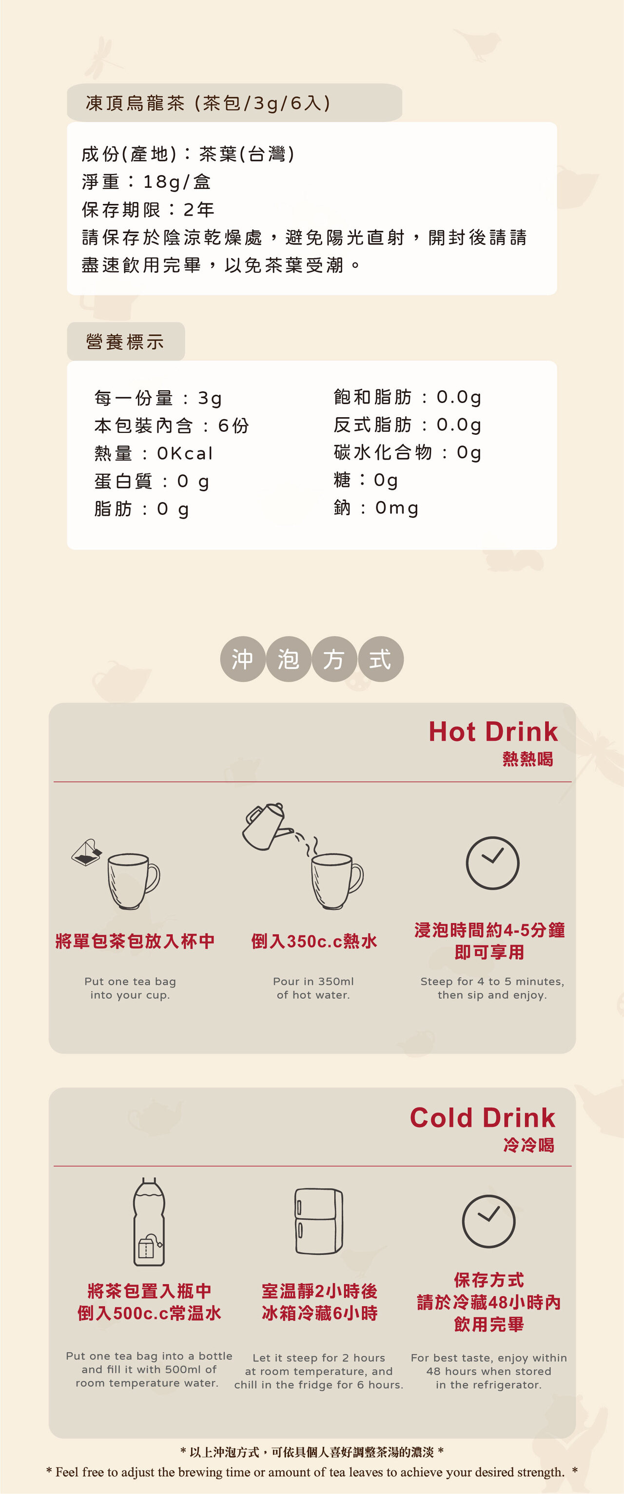 外盒採用FSC™森林認證紙材與植物性蔬菜油墨,茶包設計結合黑白印刷與漏鋁工藝,有效降低資源耗用與碳排。全系列遵循「減碳、可回收」原則,從源頭為地球降負擔。