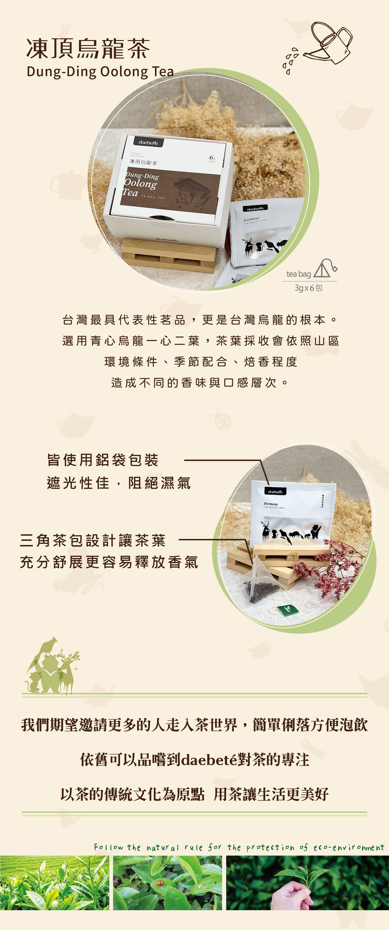 【daebeté凍頂烏龍茶|ESG減碳系列】 台灣凍頂烏龍,茶香層次豐富,如同台北樹蛙隨環境變色般多變迷人。選用青心烏龍一心二葉,依山區環境、季節與焙香程度呈現不同風味,甘韻柔和、回甘悠長。