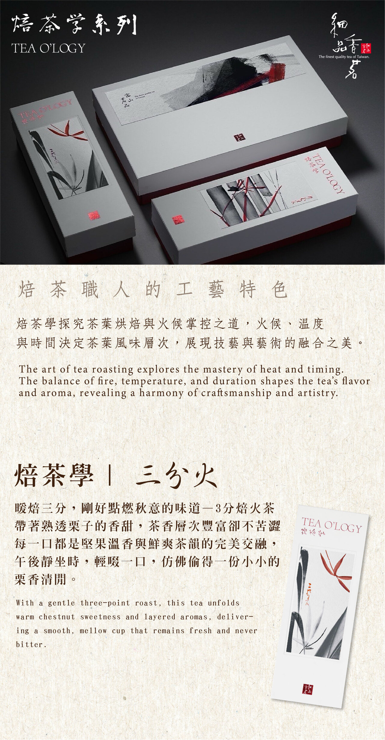 焙茶師精準掌握火候,茶葉在火與心的默契下,慢慢釋放甘果香與淡雅茶韻,餘味悠長,溫潤而深刻。無論是工作間隙的短暫放鬆,還是午後小聚的輕盈享受,3分焙火茶都是茶桌上的安心選擇。