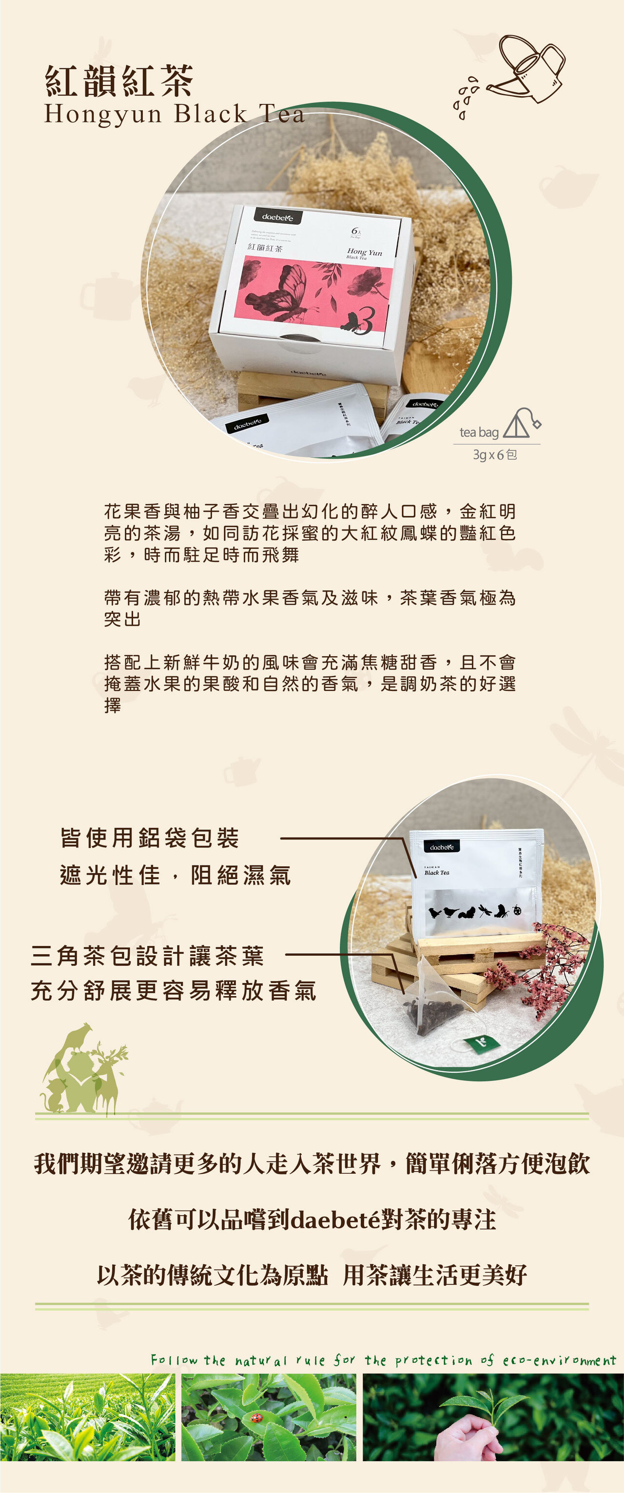 【daebeté紅韻紅茶(台茶21號)三角茶包|ESG減碳系列】 金紅明亮的茶湯,花果香與柚子香交疊,像大紅紋鳳蝶在茶香中翩翩飛舞。每一口都是小小的感官探險,也是對地球的溫柔承諾。 外盒採 FSC™ 認證紙材與植物性蔬菜油墨,茶包則以黑白印刷搭配漏鋁設計,從源頭減碳、可回收,讓你的每一次品茶都能少一點碳, 多一點暖心。紅韻紅茶,不只是茶,更是一種低碳生活的時尚態度。