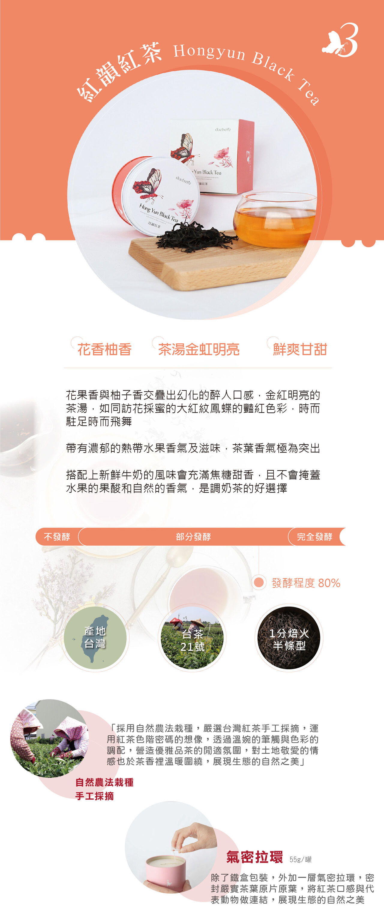 紅韻紅茶融合花果香與柚子香,金紅明亮茶湯如大紅紋鳳蝶飛舞。搭配牛奶,焦糖甜香與天然果酸完美平衡,是調製奶茶與手沖紅茶的最佳選擇,帶來熱帶水果般的迷人風味。