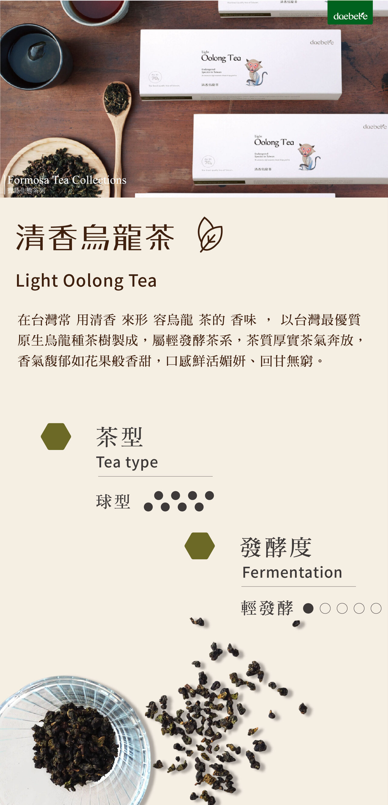 來自台灣最優質的原生烏龍茶樹,清香烏龍茶屬輕發酵茶系,每一口都是蜜黃透亮的茶湯,香氣馥郁如花果般甜美。茶質厚實、茶氣奔放,口感鮮活媚妍,