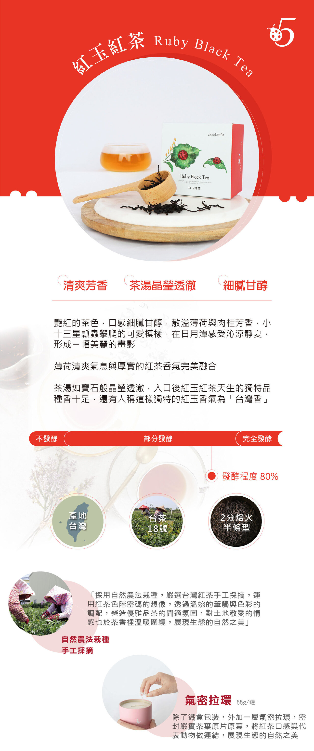 daebeté 寶島生態紅茶系列,嚴選友善栽培茶菁,保留紅玉紅茶最純粹的原葉風味。啜飲之間,彷彿看見小十三星瓢蟲在茶園間攀爬,於日月潭的靜夏微風中,