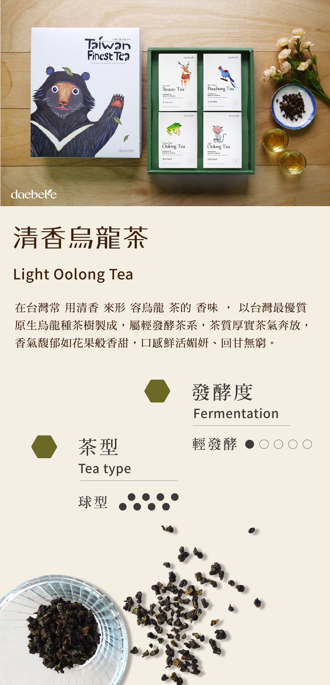 屬輕發酵茶系,茶質厚實茶氣奔放,香氣馥郁如花果般香甜,口感鮮活媚妍、回甘無窮,