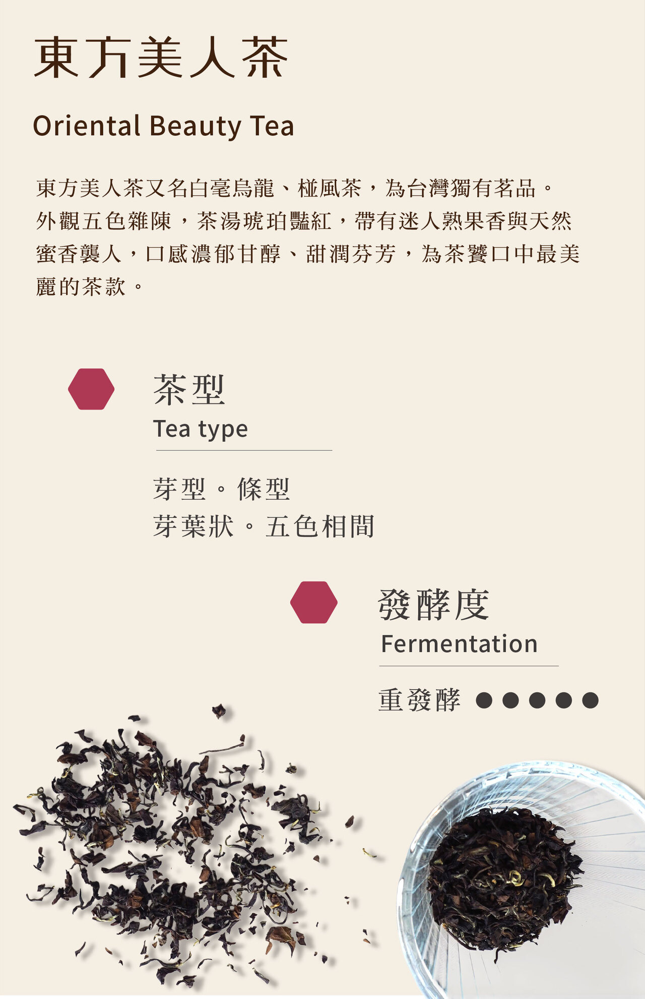外觀五色雜陳,如同美麗梅花鹿身上的斑點,茶湯琥珀豔紅,帶有迷人熟果香與天然蜜香襲人,