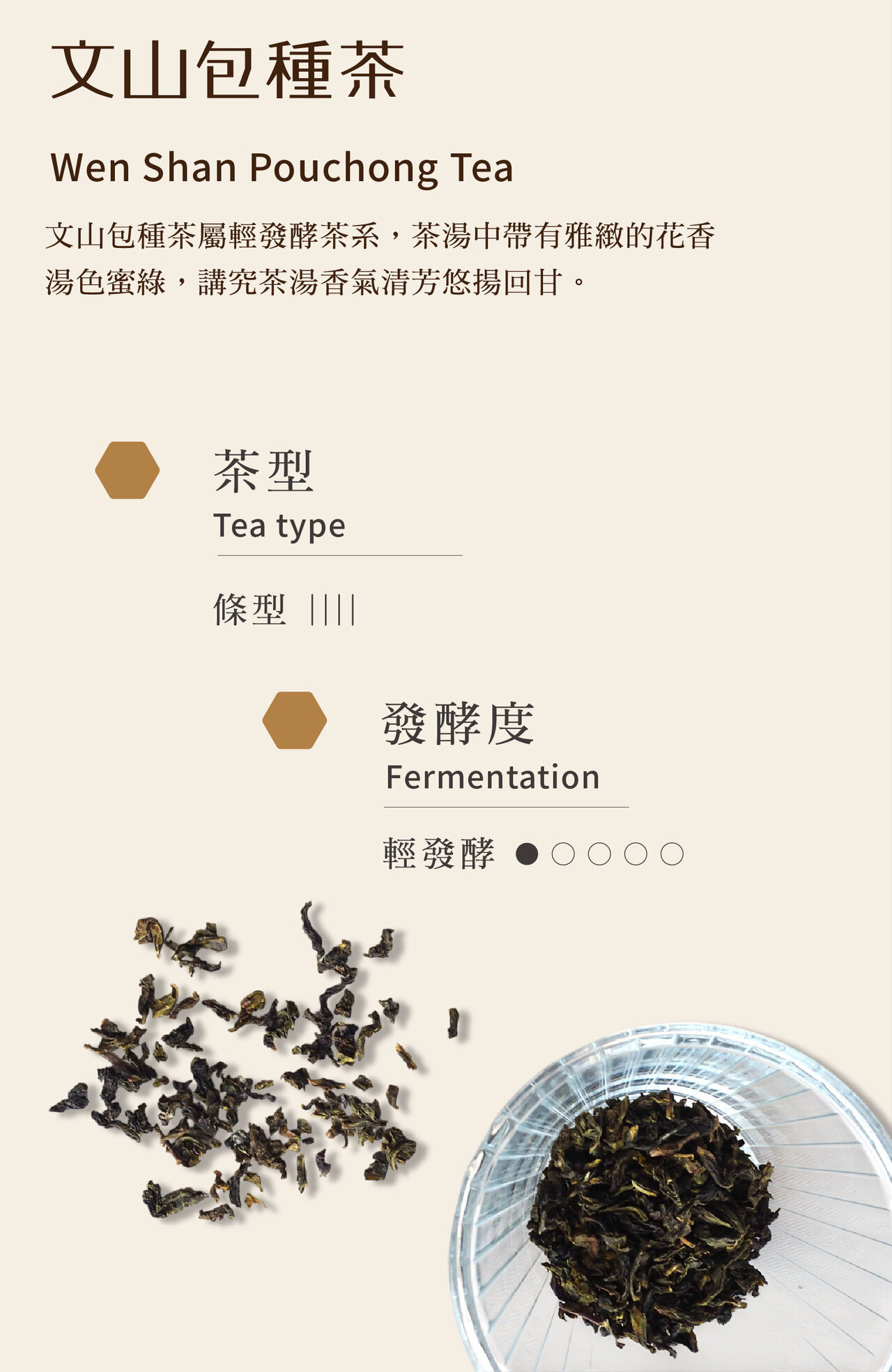 文山包種茶屬輕發酵茶系,茶湯中帶有雅緻的花香,湯色蜜綠,講究茶湯香氣清芳悠揚回甘,