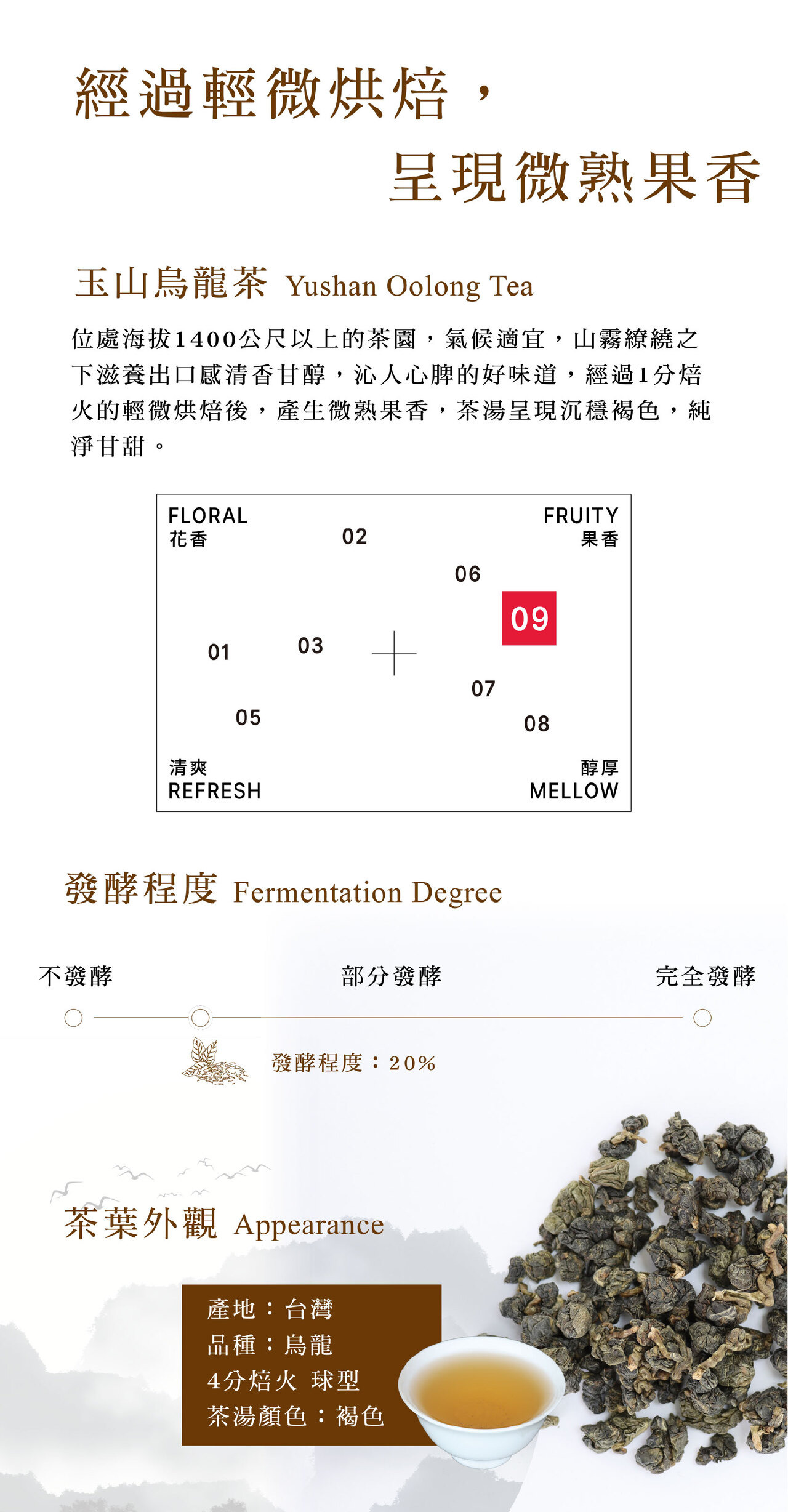 台灣之巔,玉山的氣韻悠長。來自海拔1400公尺以上的高山茶園,這款玉山烏龍茶享受日夜溫差的魔法滋養,每一片茶菁都由茶農細心手採。輕微焙火後散發微熟果香, 茶湯呈現沉穩褐色,口感純淨甘甜,讓人一口就愛上。